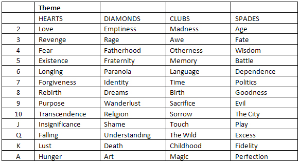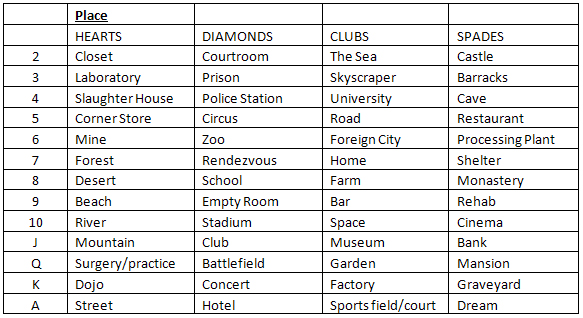 OK, here are some resources for you. You’re going to need a pack of cards to use them. This is the core of my writing work out. Deal yourself 3 cards, one for each of the tables.